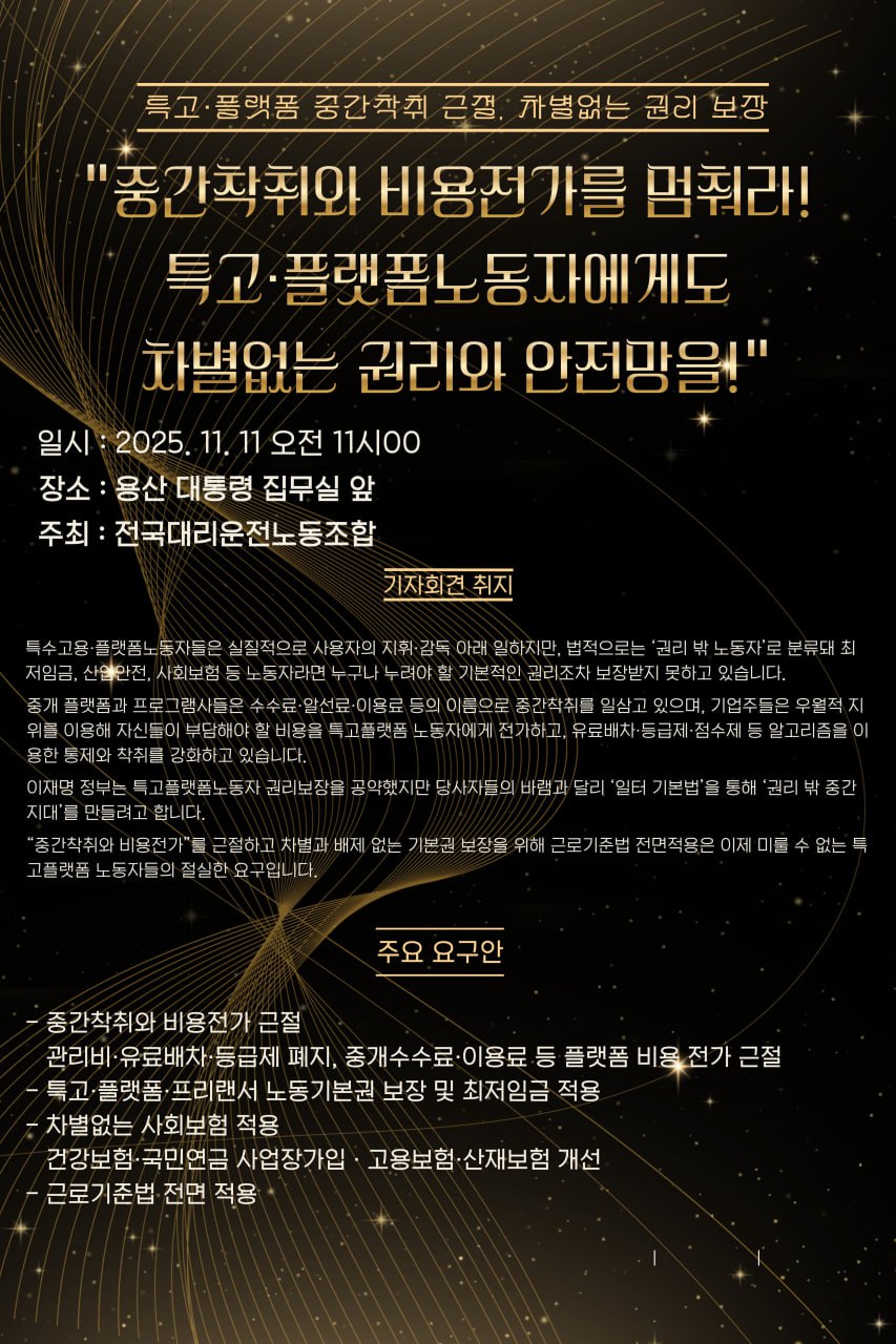 ▣ 기자회견 제목: “중간착취와 비용전가를 멈춰라! 특고·플랫폼노동자에게도 차별없는 권리와 안전망을!”