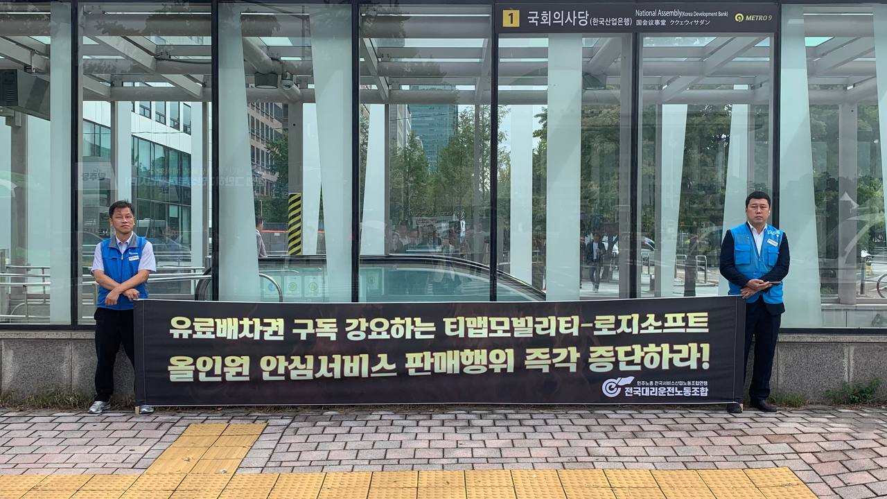 10월 14일(목) 공정거래위원장이 출석한 국정감사 일정에 맞춰 우리 노조 법인기사위원회 조합원들은 국회 앞에서 '유료배차권 판매 중단' 선전전을 진행했습니다. 이어 16일(목) 11시, 카카오모빌리티-콜마너도 시행하고 있는 '케어서비스' 판매 중단과 수수료 10% 인하를 요구하는 기자회견을 판교 카카오모빌리티 사옥 앞에서 진행하고, 선전전도 이어갈 예정입니다.