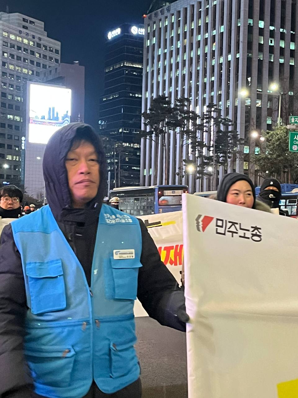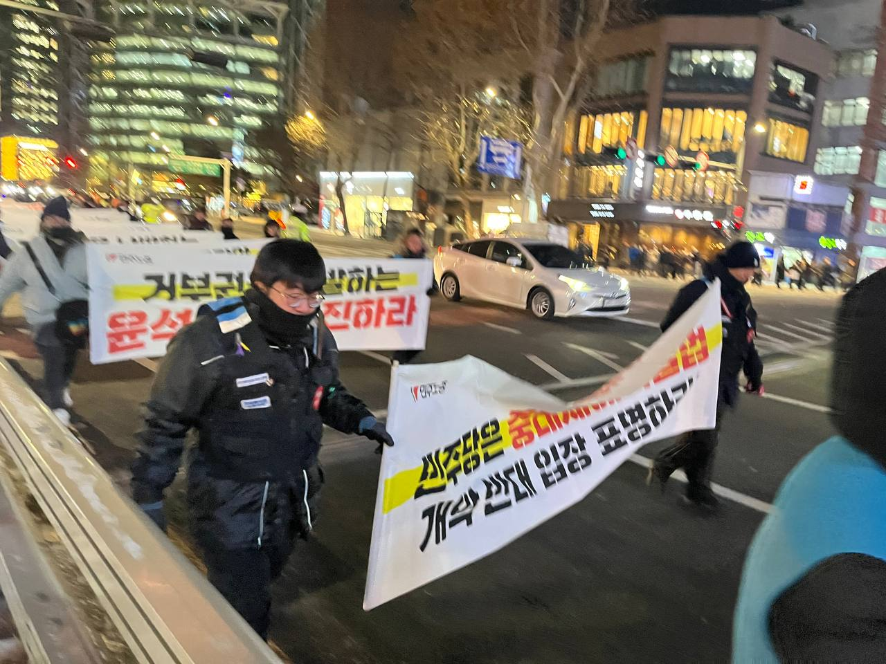영하 10도의 추위 속에서도 서비스연맹 조합원들은 현수막을 들고 서울시민들을 만나고 있습니다.