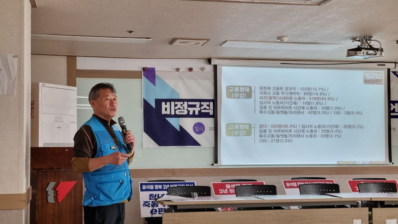 비정규직이제그만공동투쟁, 비정규직 당사자 실태조사 보고 및 현장증언대회[서울=뉴시스] 홍효식 기자 = 비정규직이제그만공동투쟁 회원들이 31일 서울 중구 민주노총에서 비정규직 당사자 실태조사 보고 및 현장증언대회를 하고 있다www.newsis.com